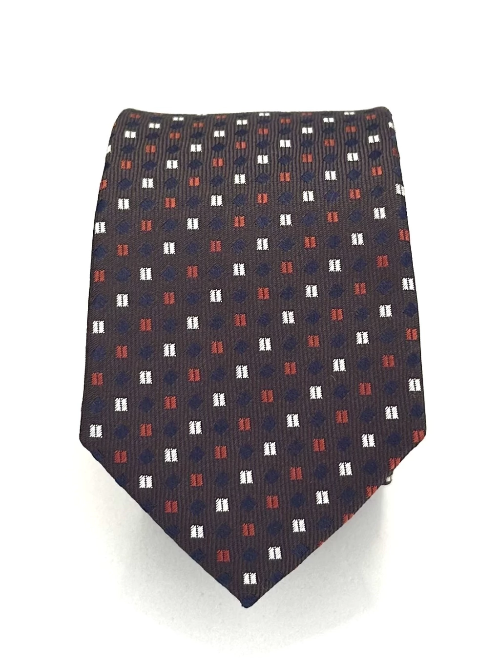 Gravata slim de seda jacquard marrom desenho clássico com detalhes em branco azul e laranja.
