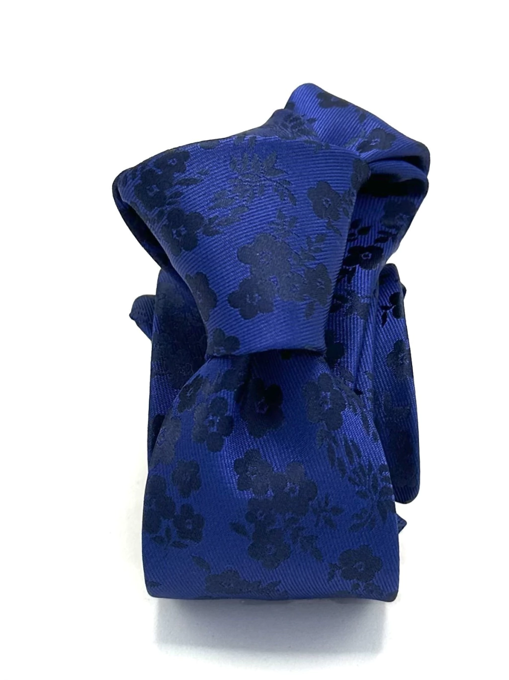 Gravata slim de seda jacquard azul royal fantasia floreal.