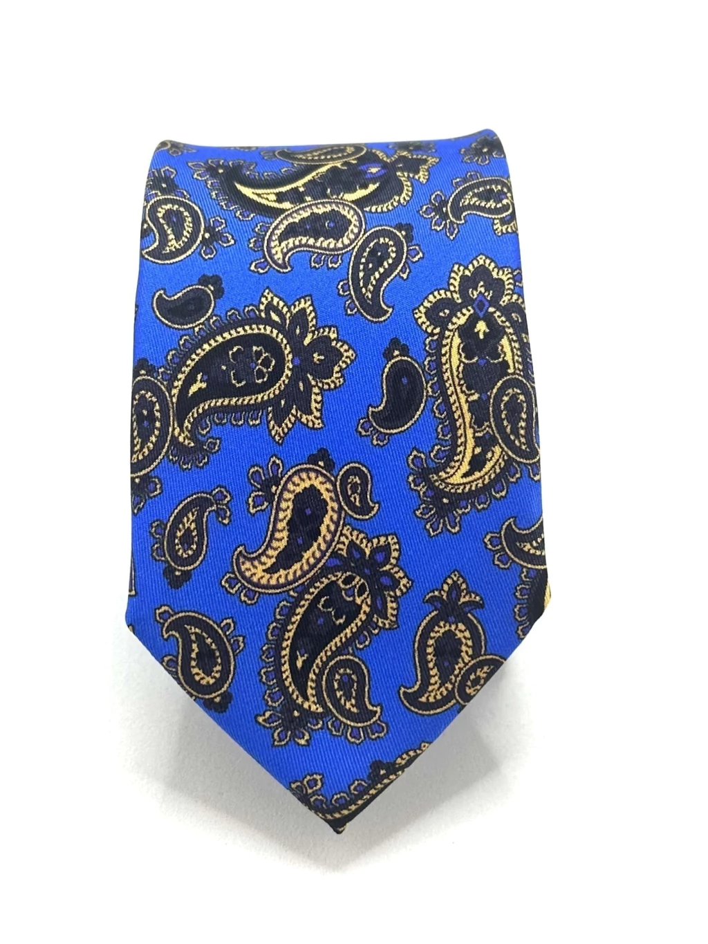 Gravata slim twill de seda azul royal desenho paisley.