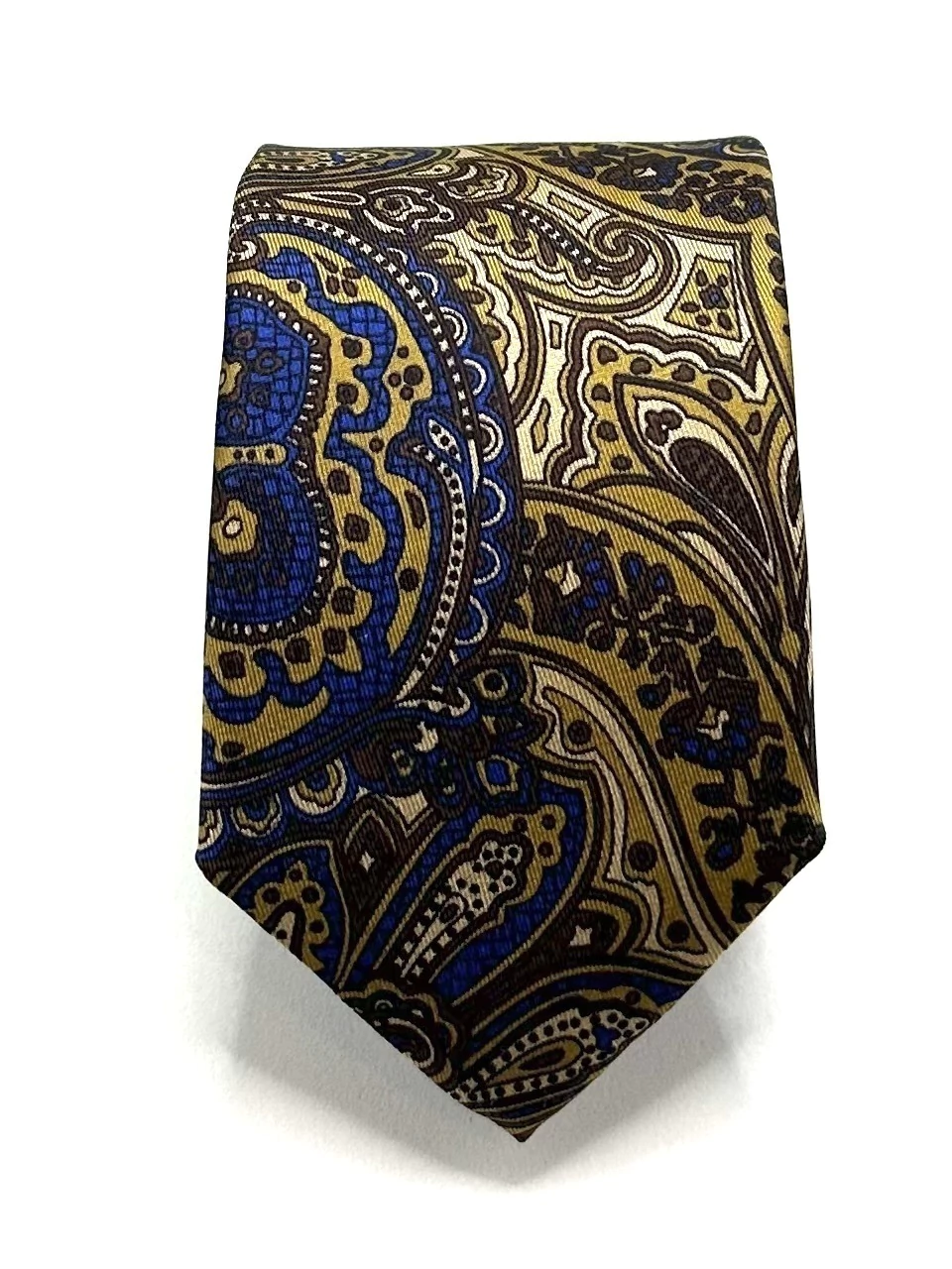 Gravata slim twill de seda desenho damascato em marrom e azul.